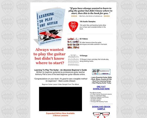 A comprehensive beginner guitar eBook with 24 structured step-by-step lessons covering need to know topics to play the guitar. Expanded edition with links to 104 audio samples, 32 videos and 19 songs. This popular eBook has multiple Amazon 5 star reviews