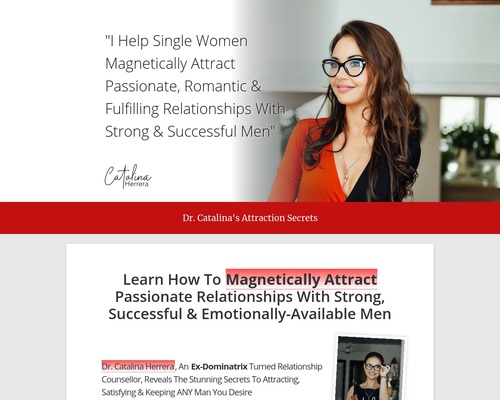 Let’s get into a little about me…I was born in Texas before moving and growing up in London.Through my late 20s and into my early 30s, I worked as a prolific “dominatrix” in London’s underground kink scene…My services were in high demand, especially amongst London’s elite: bankers, businessmen, politicians and celebrities.As someone who was extremely insecure and anxious in my younger years, being a dominatrix wasn’t a job I ever saw myself doing (even though I loved it).Being a dominatrix left me with a priceless insight as a women for which I’ll always be thankful: it taught me exactly how to control men, regardless of their status in society.It was a powerful lesson into the minds of men which few women ever get to experience…And although today I’ve hung up my whips, I now use what I learned to help today’s modern women find true, meaningful love.Since I setup practice, I’ve helped thousands of single women of all ages find, seduce, satisfy and, more importantly, keep the soulmate of their dreams.Better still: I never let my clients settle for anyone other than their knight in shining armour.I help my clients to find men who are truly worthy of their love. Men who give back. Men who provide. Men who send flowers. Men who call their mothers. Men who are there for YOU, and not only there when they want something!You can have this man in your life too, my darling. He is within your grasp!After helping thousands of independent women settle into loving, stable & committed relationships, I have condensed my teachings into a simple online formula which I call my “Magnetize Method”.It all starts with a simple 2-minute quiz, which will get you started on your path to true love by discovering your “love blocks”.In other words, you’ll discover things about yourself which you can use to stop self-sabotaging – and stop attracting toxic men!Over 10,000 independent women just like you have taken this quiz in the past three months – and many of them are already beginning their “happy ever after”…Are you ready for your true love? Then get started below!Good luck my darling,Catalina xxx