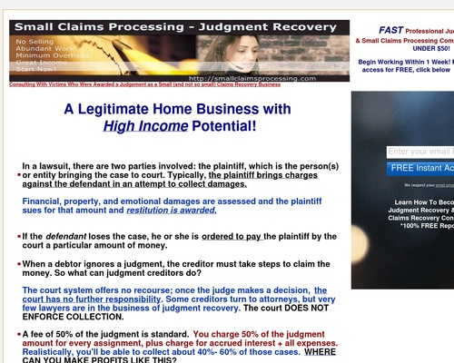 Enter a rewarding business exacting 50% contingency fees. Possibilities are endless for growth in the judgment recovery and small claims processing field. Surprise yourself with how lucrative court ordered judgment contingencies can be.
